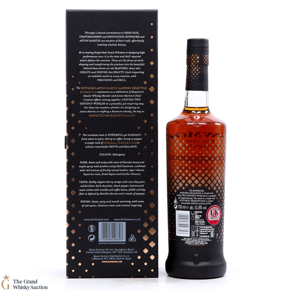 This 21-Year-Old Bowmore is a limited-edition single malt created in collaboration between Ron Welsh, Bowmore Master Blender and Marek Reichman, Aston Martin Chief Creative Officer. Matured in a combination of oloroso and Pedro Ximenez sherry casks. The result is a single malt that thrills all the senses for optimal enjoyment.