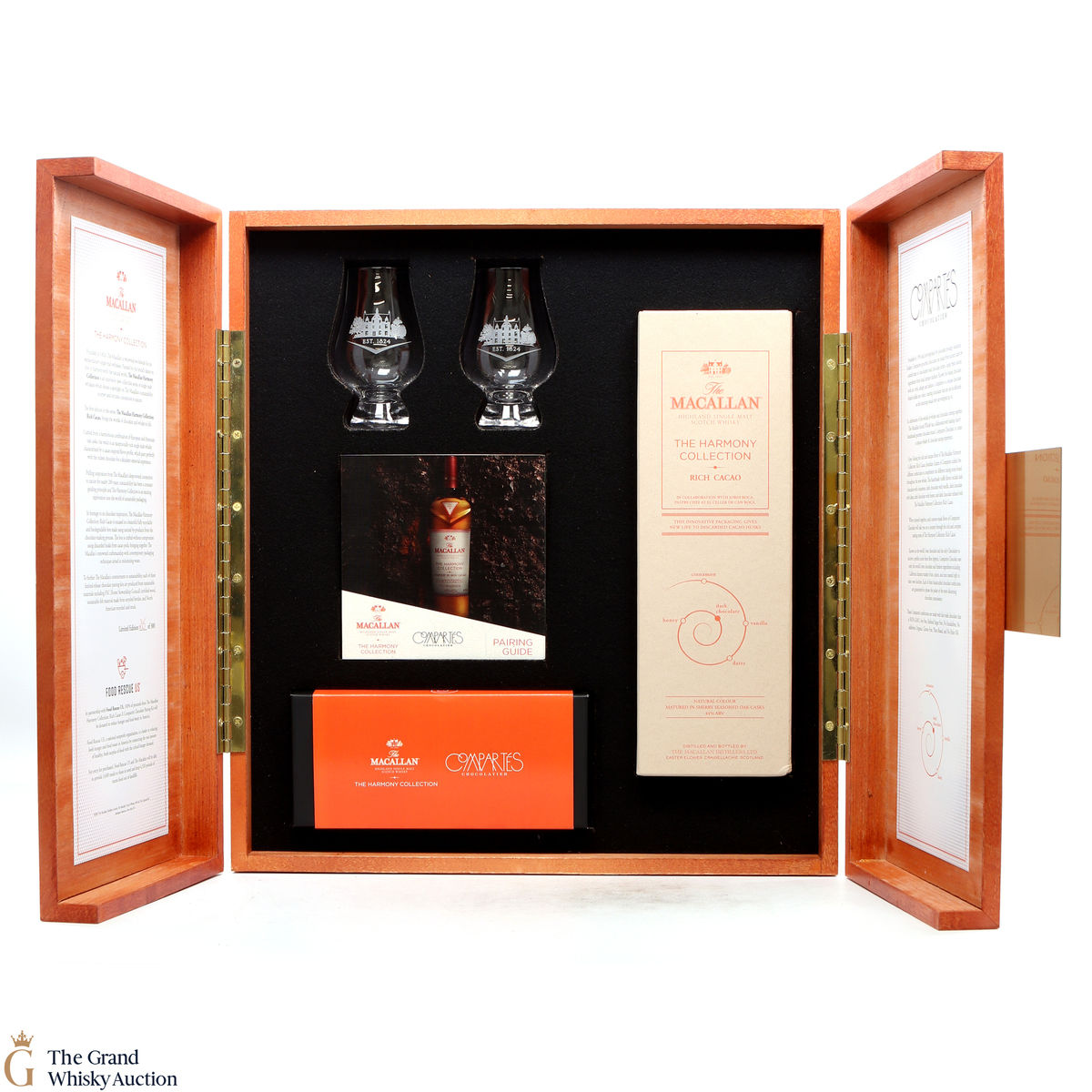 The pairing kit includes 1 x 70cl bottle of The Macallan Harmony Collection Rich Cacao, a 10-piece box of custom-made Compartés Chocolate inspired by the tasting notes of the whisky, a pairing guide and two Macallan Glencairn glasses.