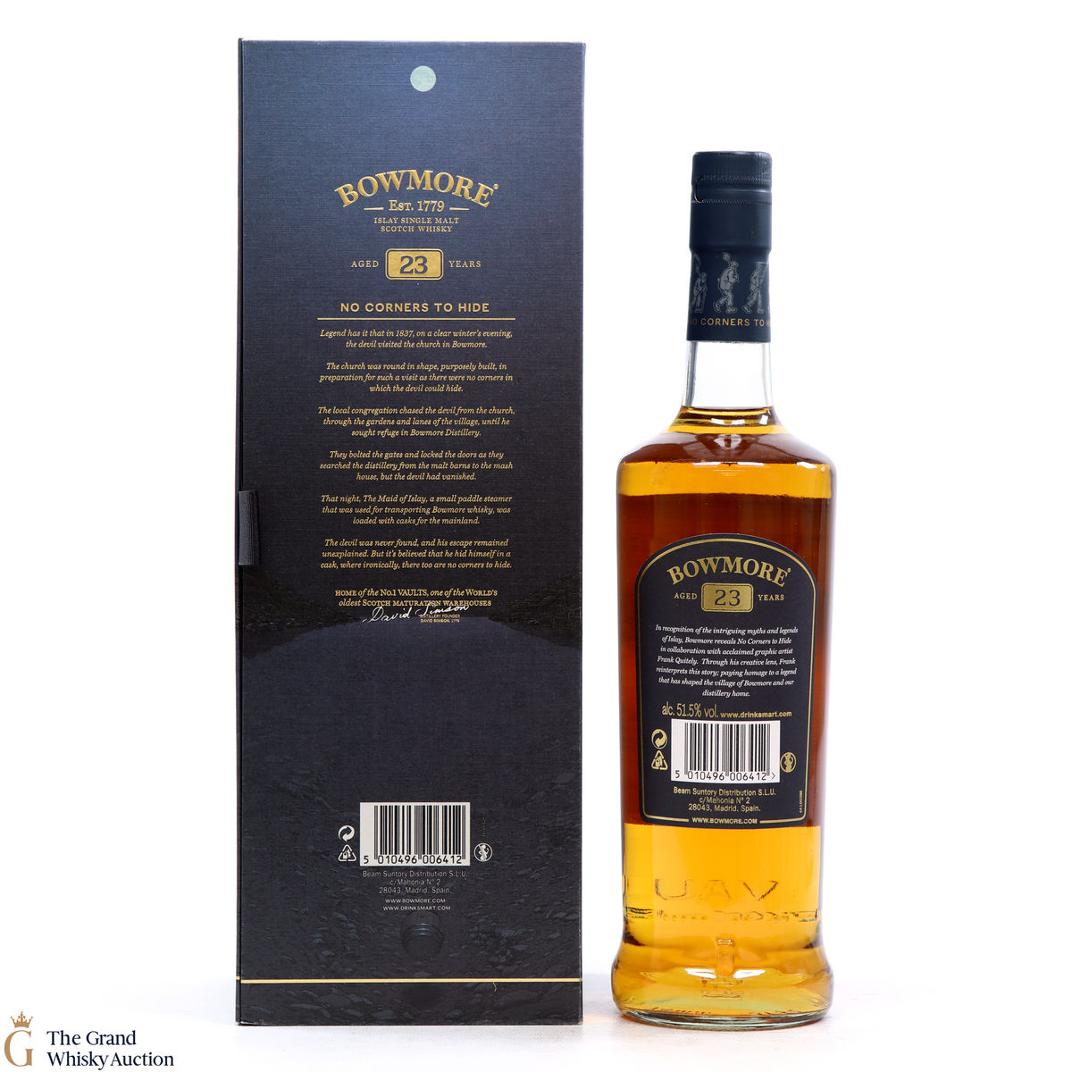 The limited release Bowmore No Corners to Hide 23 Year Old was matured for 21 years in ex-bourbon American oak hogsheads and finished for two years in Essencia barriques. Bottled at 51.5% ABV.