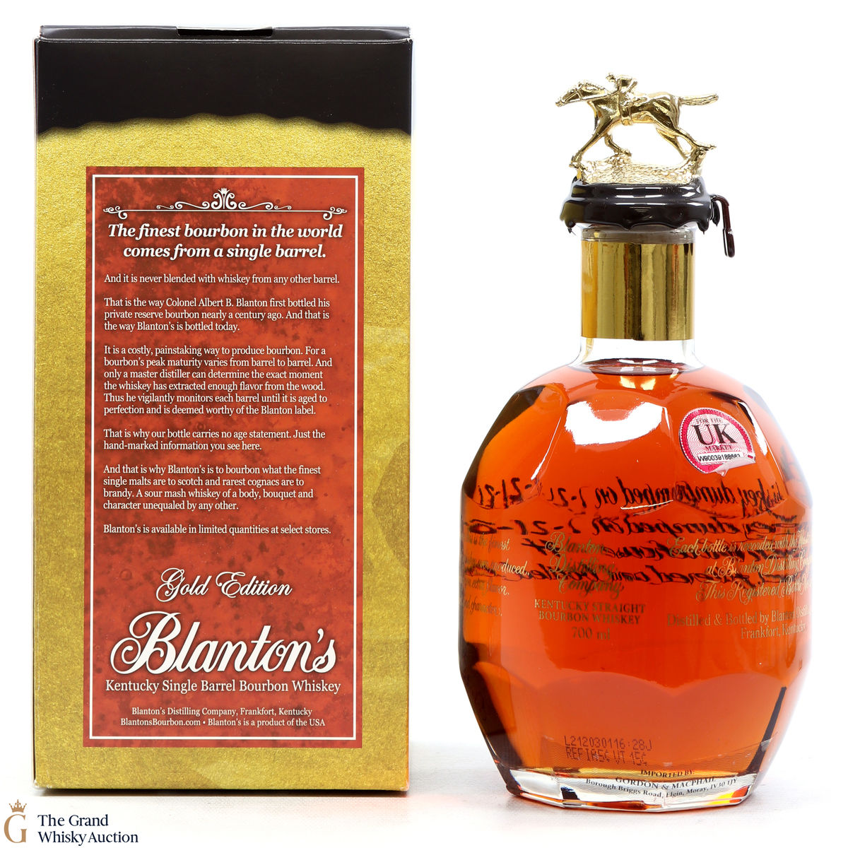 PLEASE NOTE: The wax seal on Blanton's bottles are prone to cracking in transit due to their design. Therefore, as stated in our T&C’s, we do not and will not accept liability should the seal be breached, broken, split or leak in transit. Additionally, please know due to the design of the internal cardboard packaging that surrounds the top of the bottles, it too may be torn. By bidding on this lot you have understood this to be true. Insurance is for complete breakage or loss in transit only.