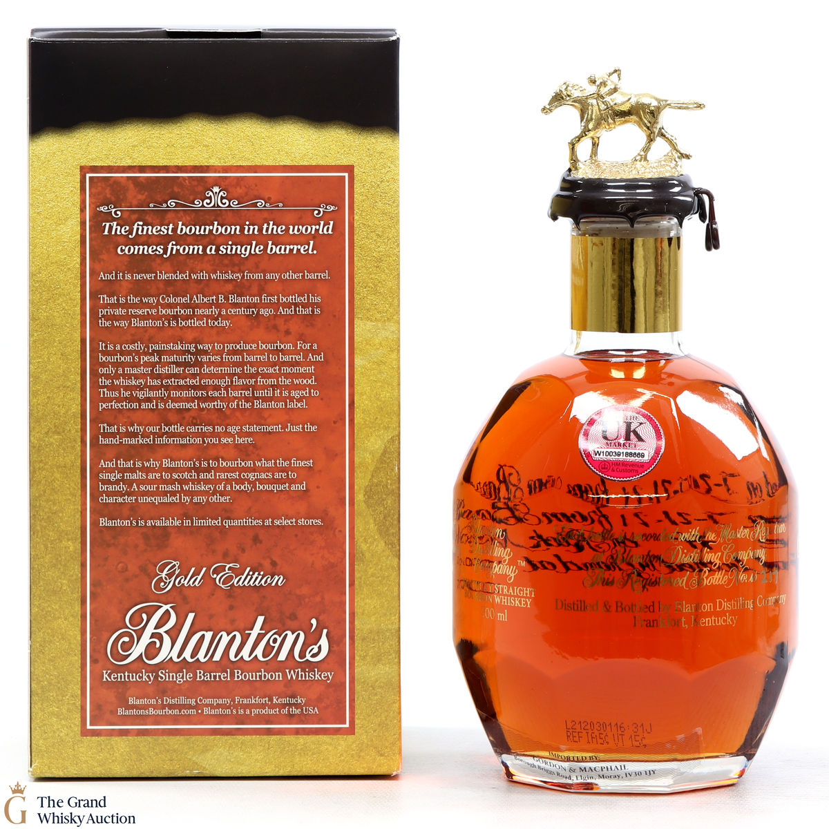 PLEASE NOTE: The wax seal on Blanton's bottles are prone to cracking in transit due to their design. Therefore, as stated in our T&C’s, we do not and will not accept liability should the seal be breached, broken, split or leak in transit. Additionally, please know due to the design of the internal cardboard packaging that surrounds the top of the bottles, it too may be torn. By bidding on this lot you have understood this to be true. Insurance is for complete breakage or loss in transit only.