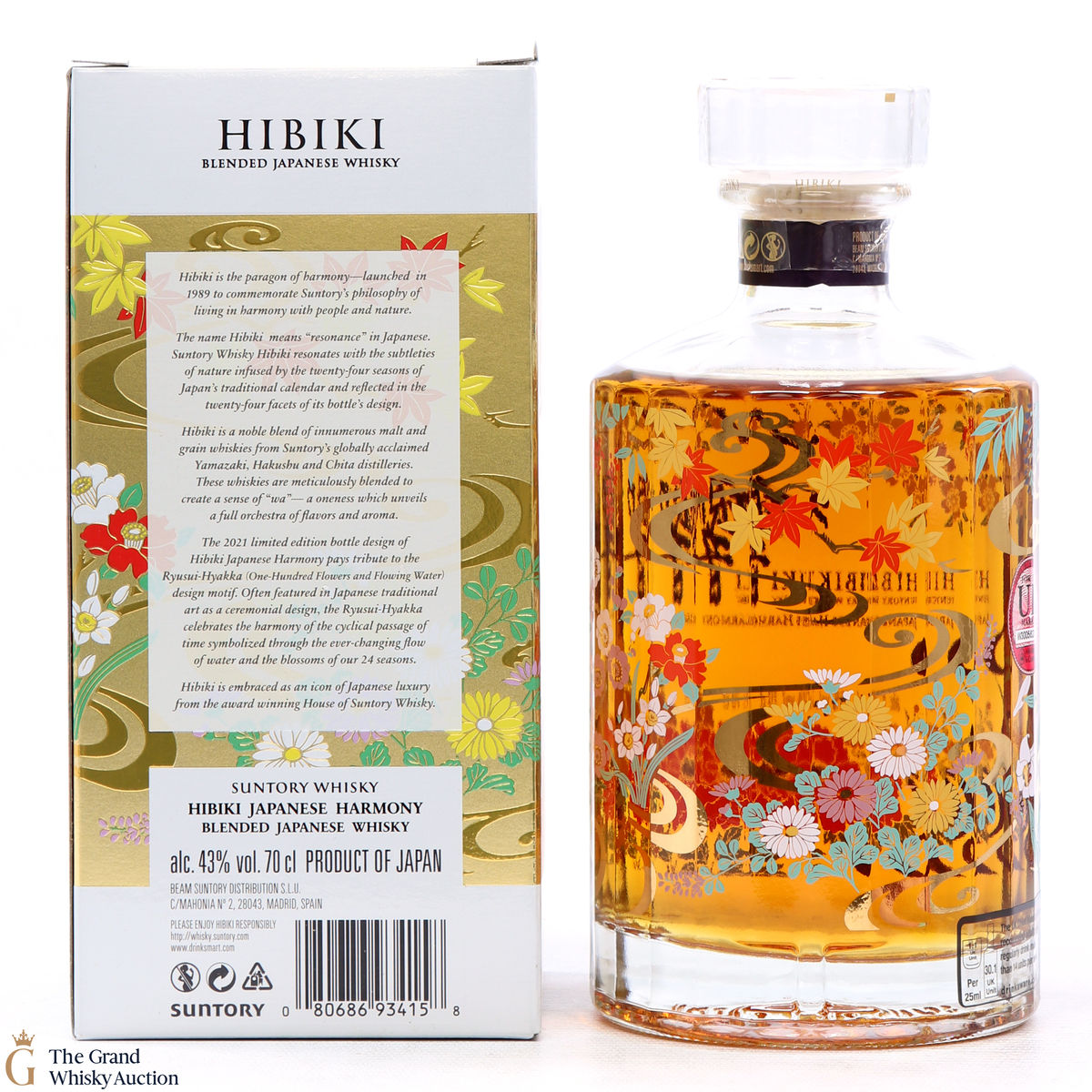 This is a limited edition, specially designed bottle with painted flowers and flowing ribbons of water. The 2021 special edition pays homage to the Ryisui-Hyakka (One Hundred Flowers and Flowing Water) and celebrates different seasonal flowers which help characterise the Japanese seasons. 5 types of casks were used and in typical Hibiki fashion, the bottle always has 24 facets which represent 24 seasons in the Japanese lunar calendar.