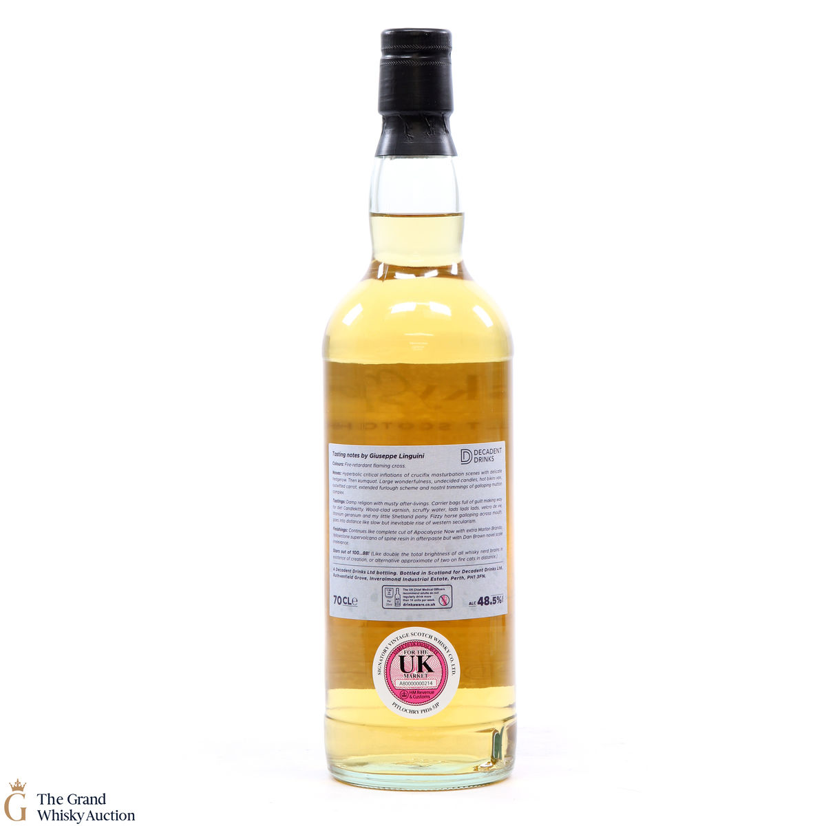 Due to the various ages of bottles and their seals, the condition of liquid is at the buyer's discretion and no claim can be lodged against failure/leakage in transit. Loss and breakage cover is available at 3% of the hammer price as standard. If the lot is not insured, no claim can be lodged against the courier or The Grand Whisky Auction for breakage or loss in transit.