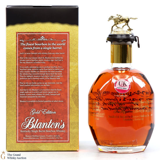 PLEASE NOTE: The wax seal on Blanton's bottles are prone to cracking in transit due to their design. Therefore, as stated in our T&C’s, we do not and will not accept liability should the seal be breached, broken, split or leak in transit. Additionally, please know due to the design of the internal cardboard packaging that surrounds the top of the bottles, it too may be torn. By bidding on this lot you have understood this to be true. Insurance is for complete breakage or loss in transit only.