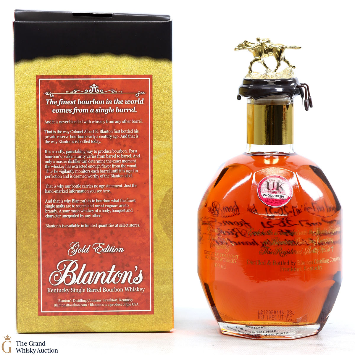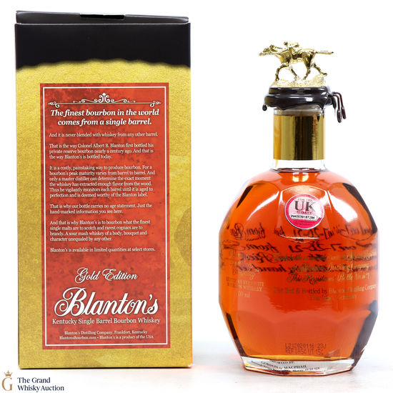 PLEASE NOTE: The wax seal on Blanton's bottles are prone to cracking in transit due to their design. Therefore, as stated in our T&C’s, we do not and will not accept liability should the seal be breached, broken, split or leak in transit. Additionally, please know due to the design of the internal cardboard packaging that surrounds the top of the bottles, it too may be torn. By bidding on this lot you have understood this to be true. Insurance is for complete breakage or loss in transit only.