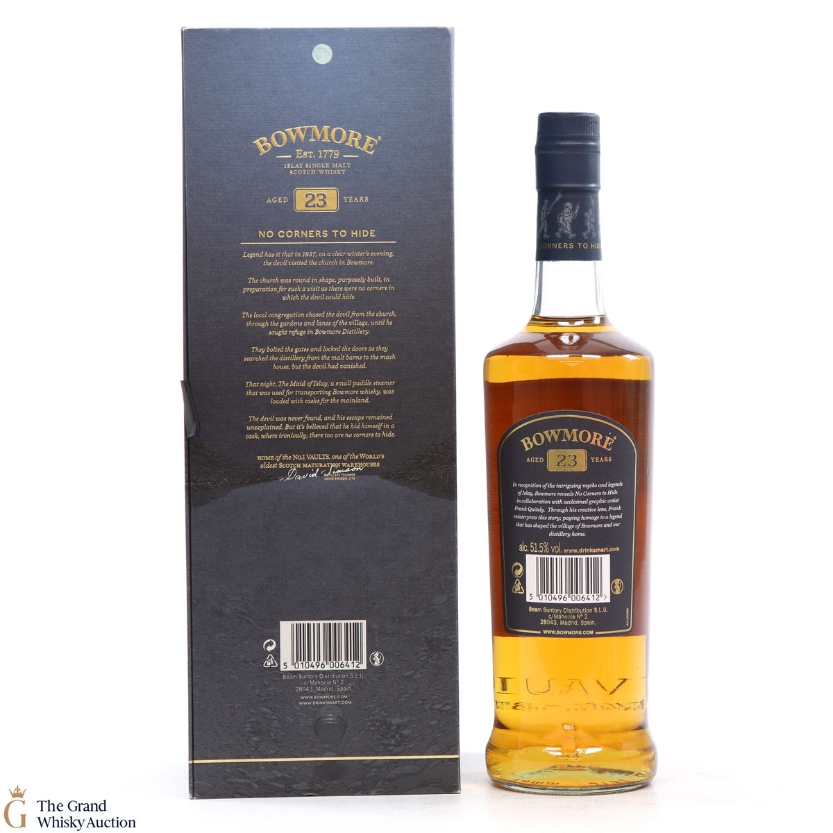 The limited release Bowmore No Corners to Hide 23 Year Old was matured for 21 years in ex-bourbon American oak hogsheads and finished for two years in Essencia barriques. Bottled at 51.5% ABV.