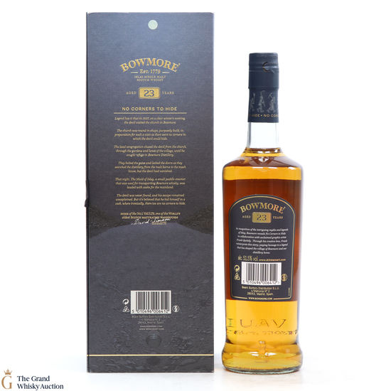 The limited release Bowmore No Corners to Hide 23 Year Old was matured for 21 years in ex-bourbon American oak hogsheads and finished for two years in Essencia barriques. Bottled at 51.5% ABV.