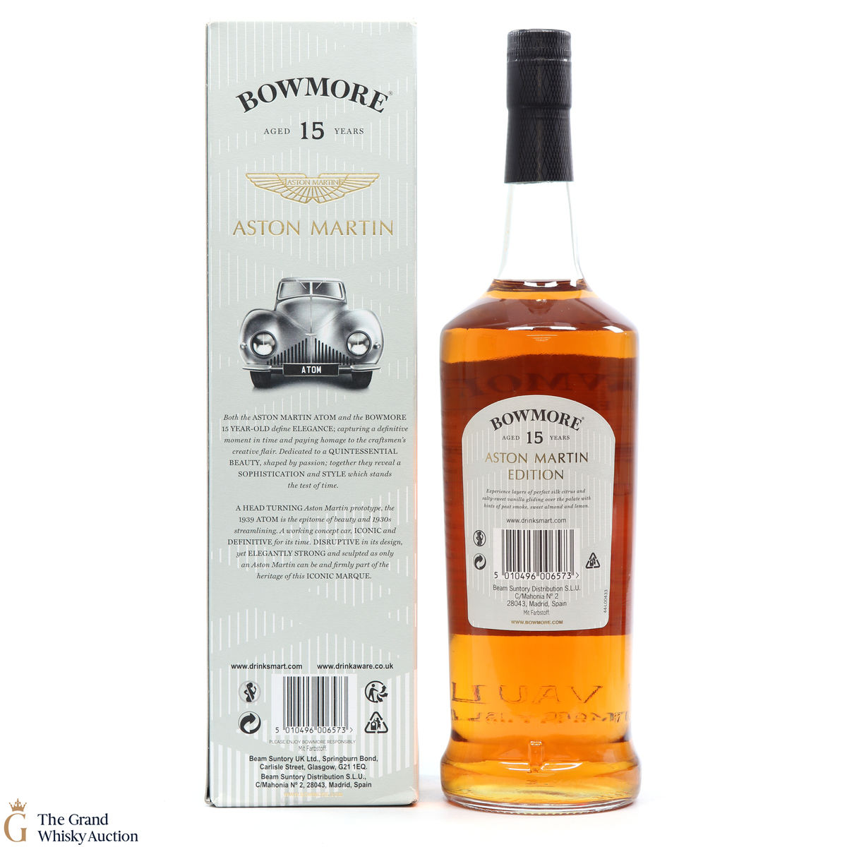 Distilled at the Bowmore Distillery in Islay, this 15 year old single malt was married in first fill bourbon casks. This is the first edition bottling to celebrate the collaboration with Aston Martin, named Dark and Intense it is available exclusively to global travellers. Each of the three editions of the Aston Martin Series features a different car, the 15 has the ATOM.