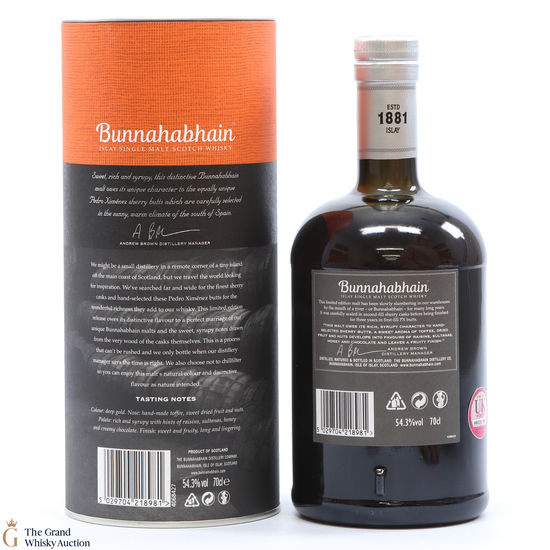 A limited-edition bottling from the Bunnahabhain distillery on the northeast coast of Islay. Distilled in 2003 and was initially aged in second-fill Sherry casks until 2011. At this point, the whisky was transferred over to yet more Sherry casks - first-fill Pedro Ximénez casks! It was bottled in 2017 at cask strength. This is one of 6768 individually numbered bottles.