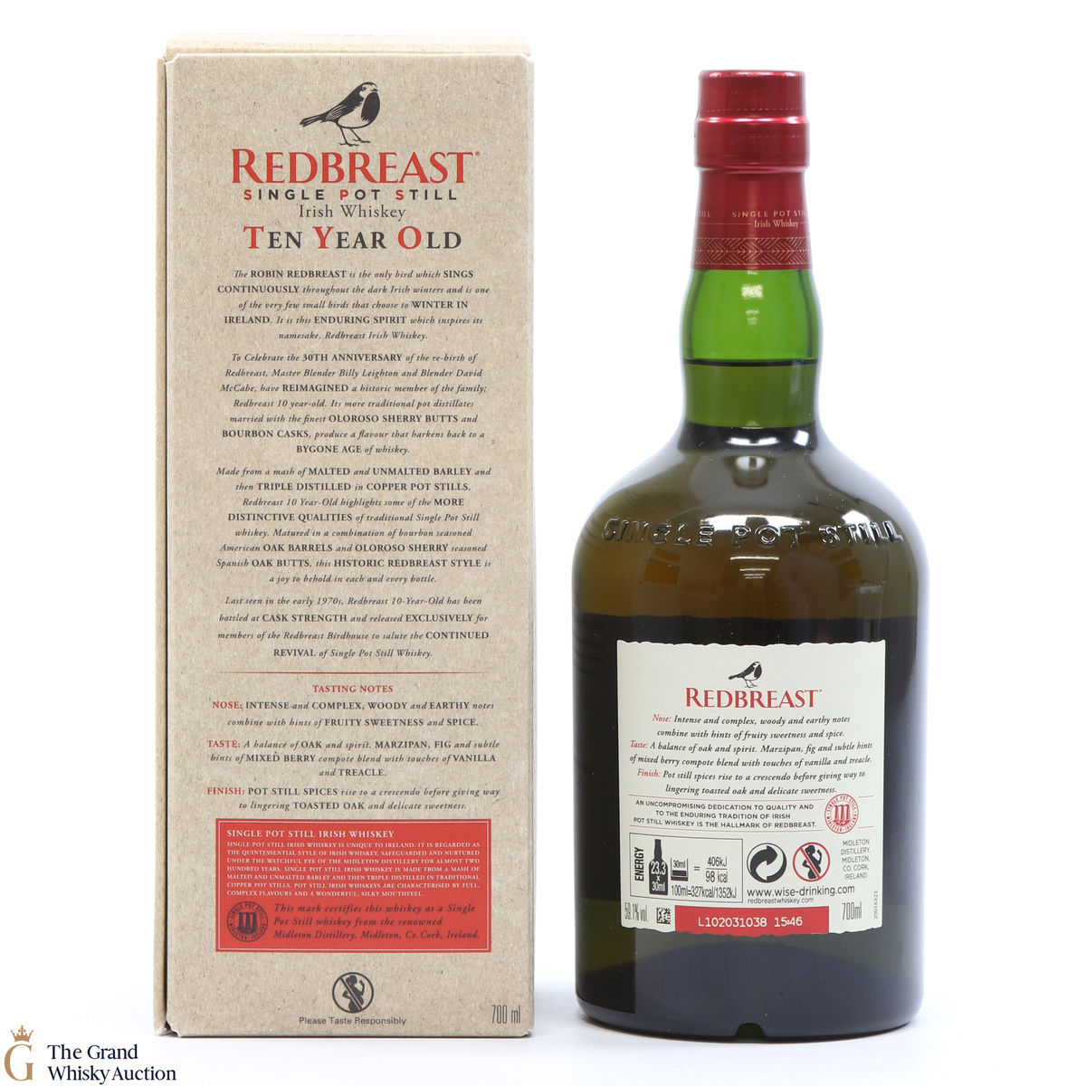 Redbreast 10 Year Old is a Bird House Exclusive bottling to celebrate the 30th anniversary of the re-birth of the Redbreast. Matured in a combination of bourbon seasoned American oak barrels and Oloroso sherry seasoned Spanish oak butts before being bottled at cask strength of 59.1% ABV is from batch 1.