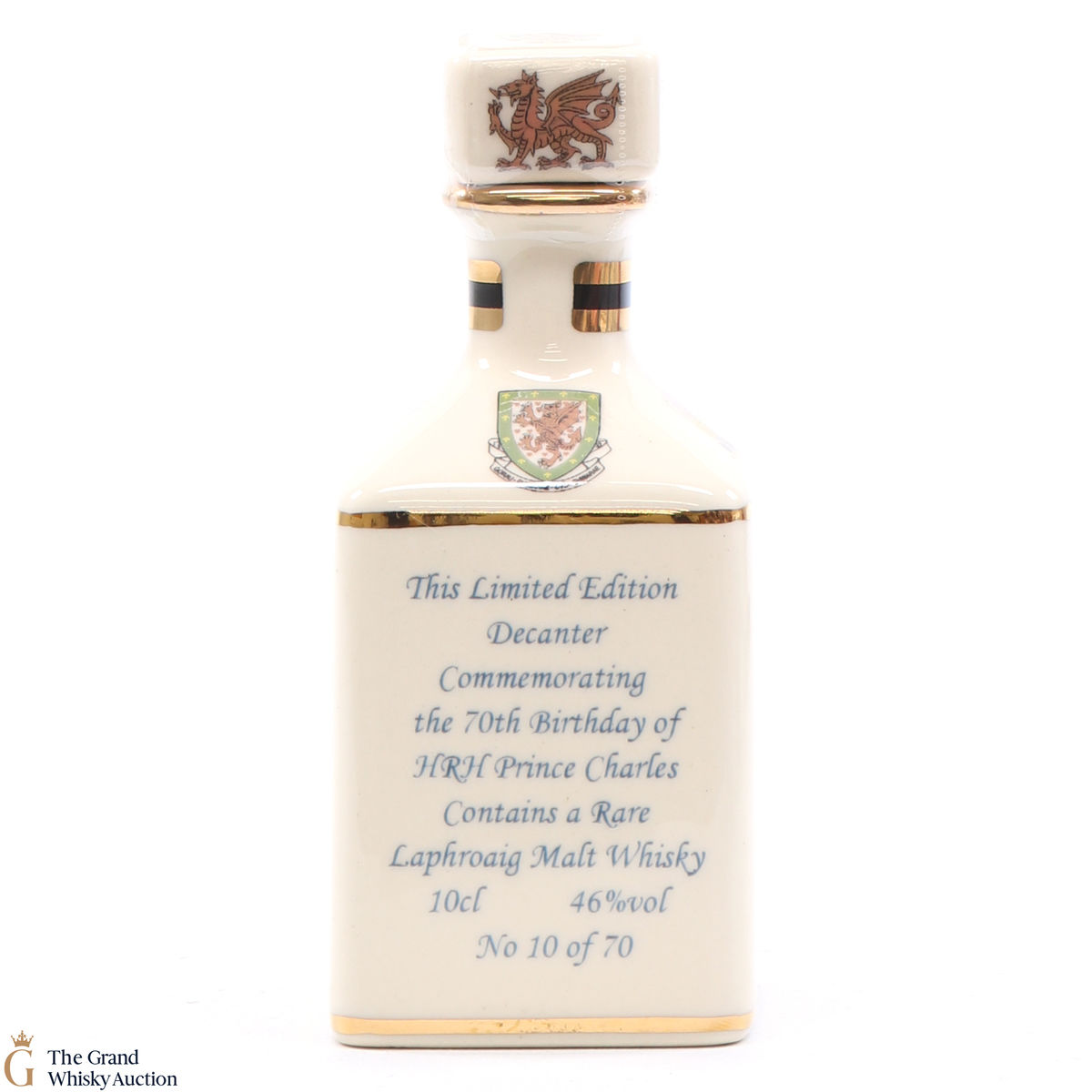 A mini decanter commemorating the 70th birthday of HRH Prince Charles. Filled with Laphroaig, this is one of 70 bottles released.