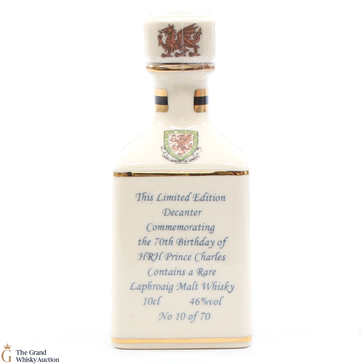A mini decanter commemorating the 70th birthday of HRH Prince Charles. Filled with Laphroaig, this is one of 70 bottles released.