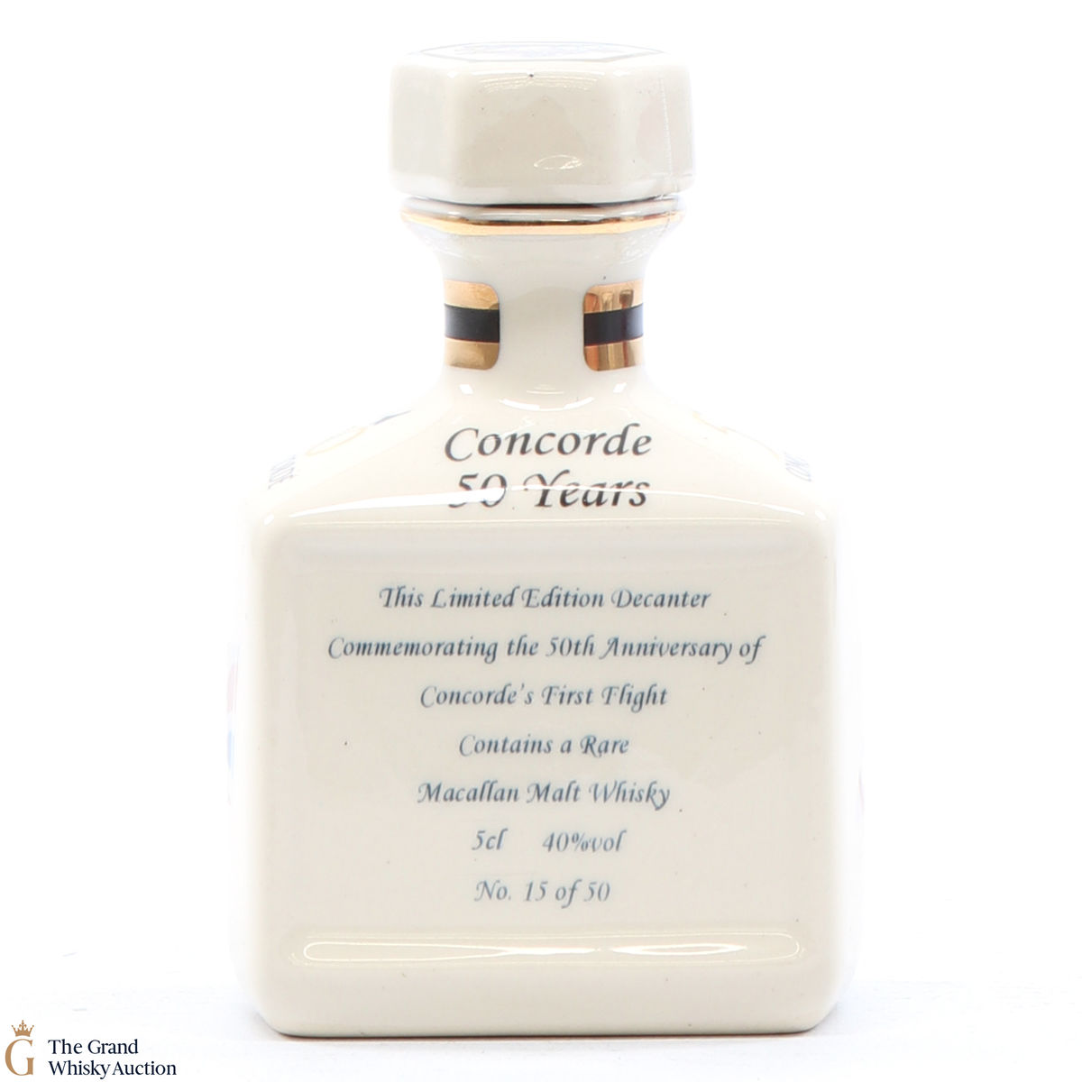 A mini decanter commemorating the 50th anniversary of Concorde's First Flight. Filled with Macallan, this is one of 50 bottles released.