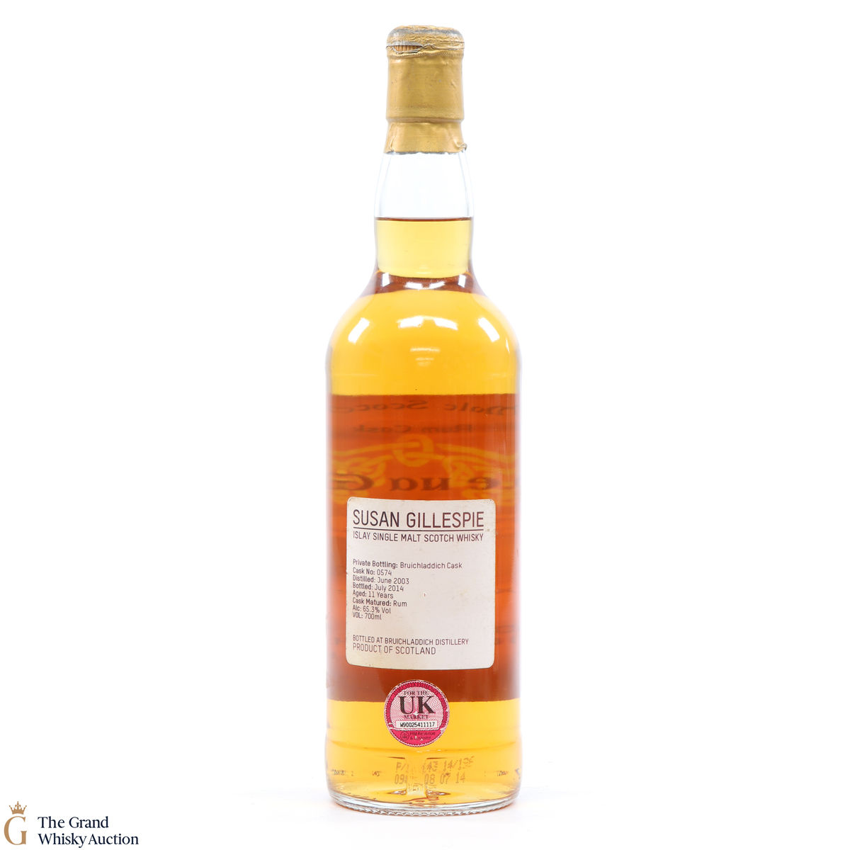 Distilled in June 2003, this private single cask release from Bruichladdich was bottled after 11 years of maturation in a Rum cask.
