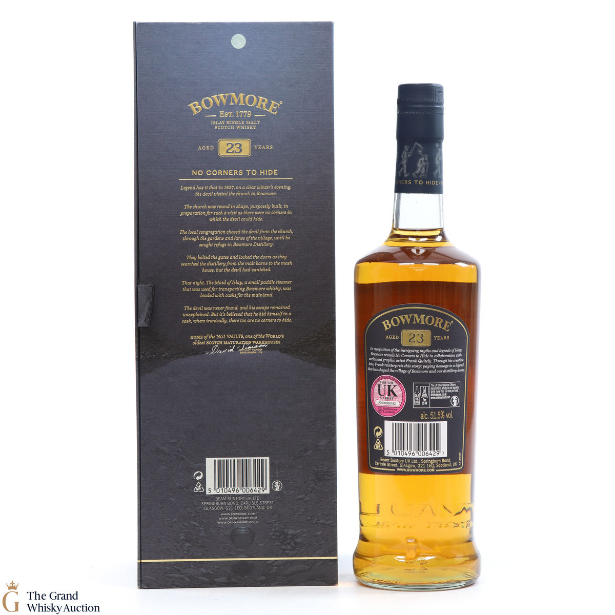 The limited release Bowmore No Corners to Hide 23 Year Old was matured for 21 years in ex-bourbon American oak hogsheads and finished for two years in Essencia barriques. Bottled at 51.5% ABV.