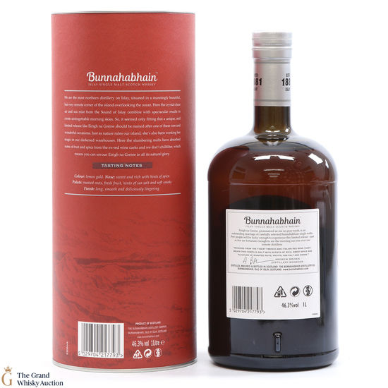 Bunnahabhain's Eirigh Na Greine was originally released for the Travel Retail market. This bottling was named 'Eirigh Na Greine' meaning 'Morning Sky' in Gaelic. It is made up from various ages of Bunnahabhain single malt, primarily matured in high-quality red wine casks which has resulted in juicy berry notes throughout, blending well with the wafts of sea salt and orchard fruit. This is a 1-litre bottling.