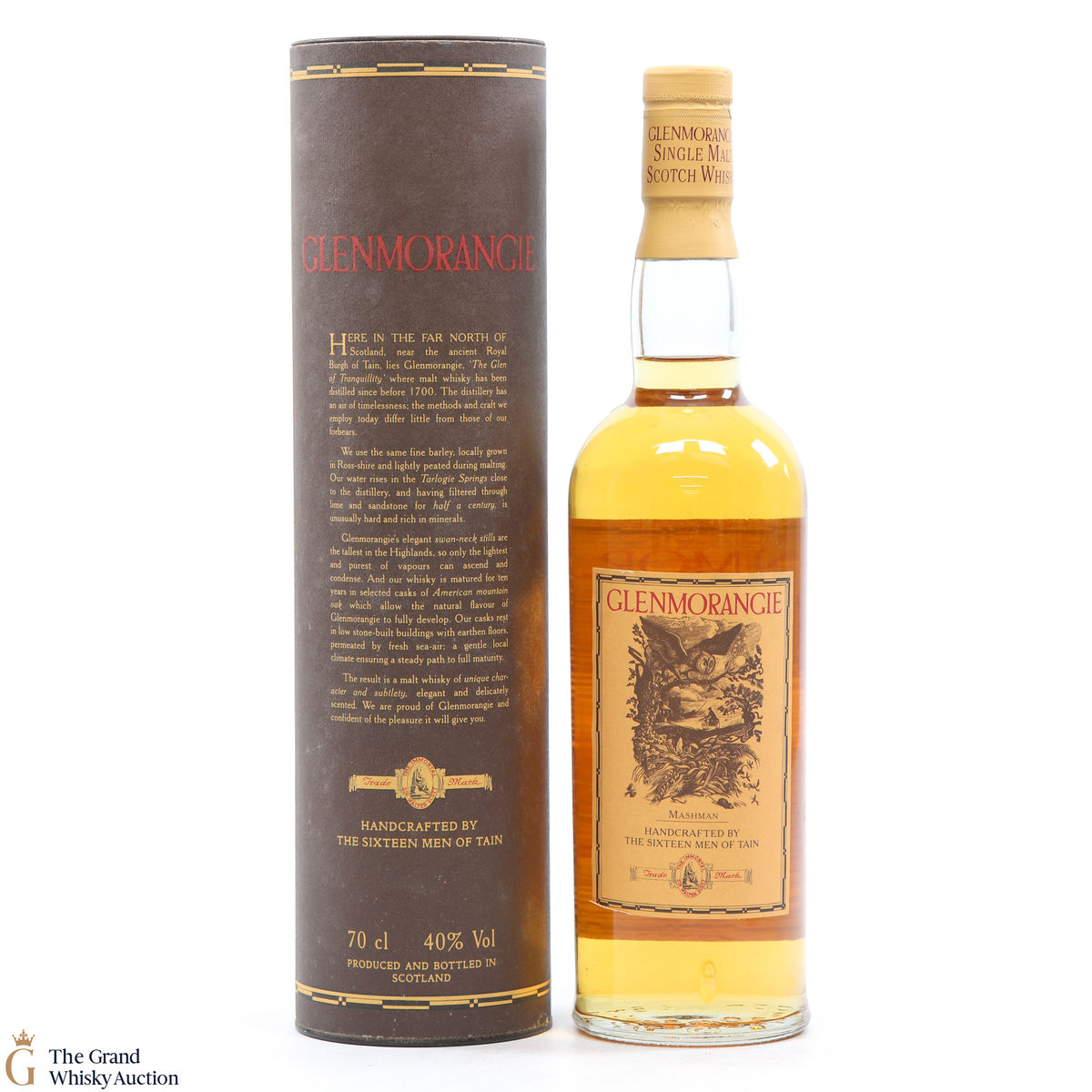 An older style bottling of Glenmorangie 10-year-old. Handcrafted by the sixteen men of Tain.