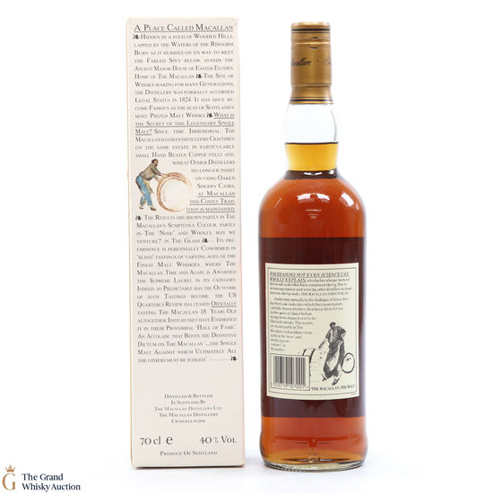 This is an old-style presentation of Macallan 10 Year old was bottled in the 1990's. This classic Speyside malt whisky matured in sherry oak casks from Jerez. Very collectable.