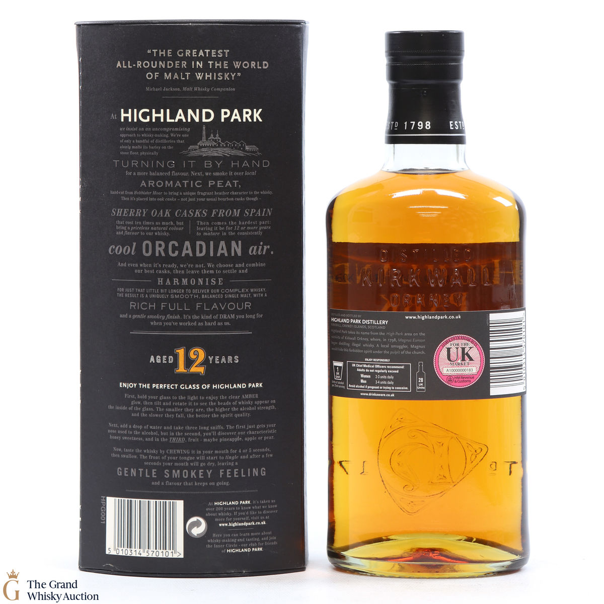 Highland Park 12 year old - one of the best malts in the world year on year. This bottling has been in its core range for over 100 years. This design of the bottle was used by Highland Park from 1999 to the early 2000s.