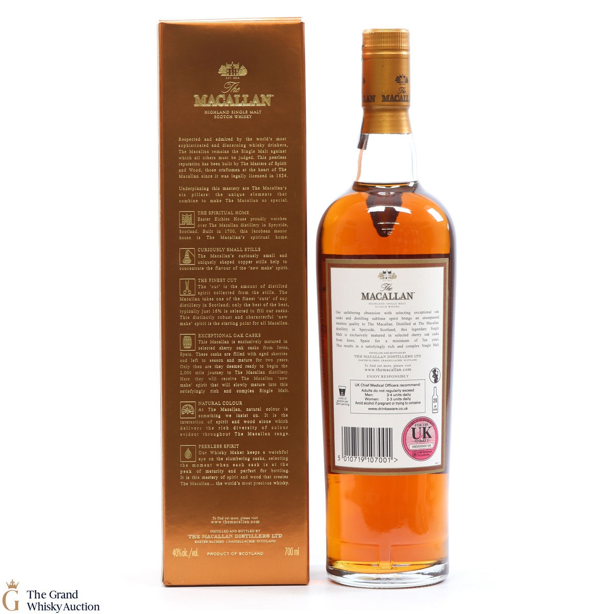 A 10 year old single malt from The Macallan Distillery. It has been exclusively matured in selected sherry oak casks from Jerez, Spain.