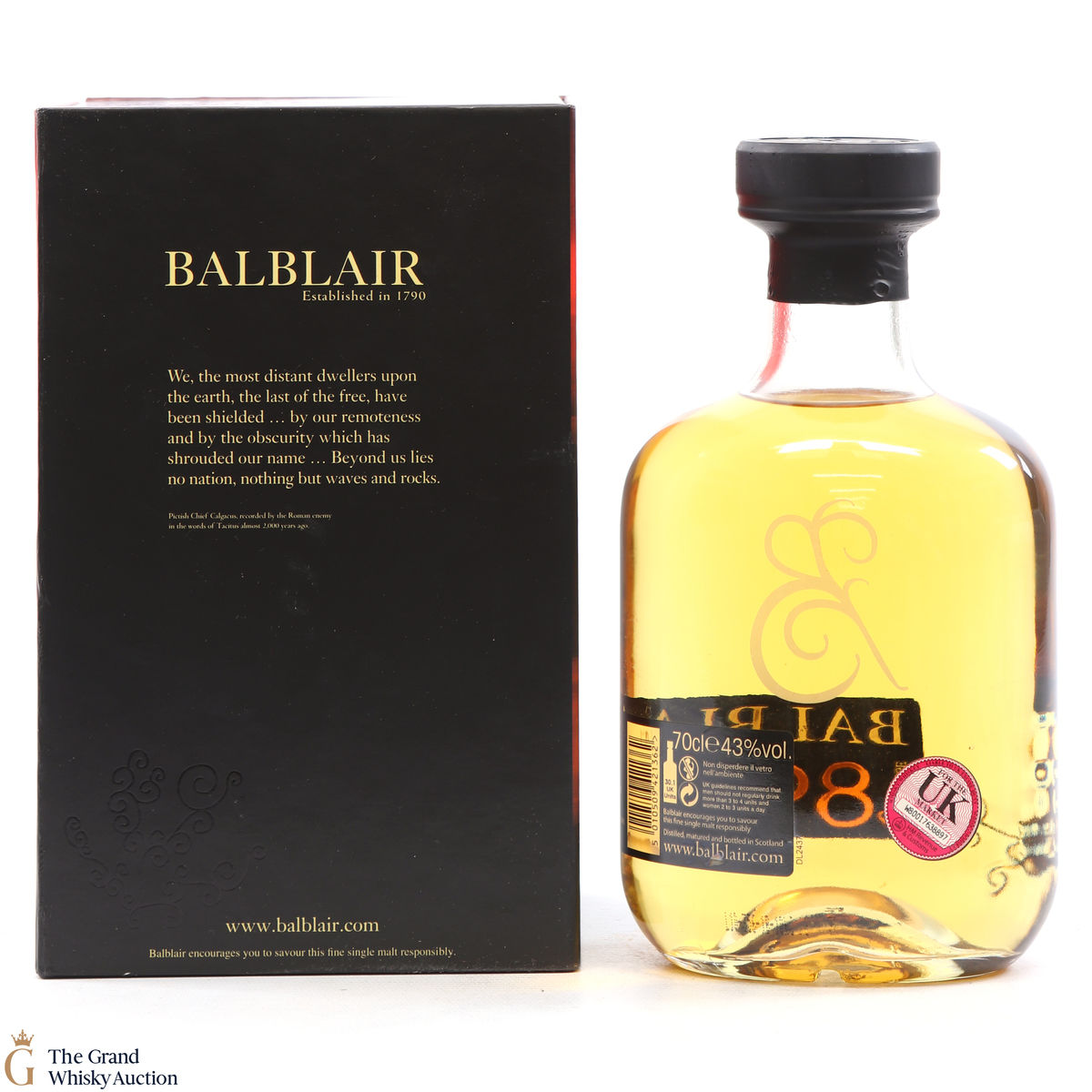 Due to the various ages of bottles and their seals, the condition of liquid is at the buyer's discretion and no claim can be lodged against failure/leakage in transit. Loss and breakage cover is available at 3% of the hammer price as standard. If the lot is not insured, no claim can be lodged against the courier or The Grand Whisky Auction for breakage or loss in transit.