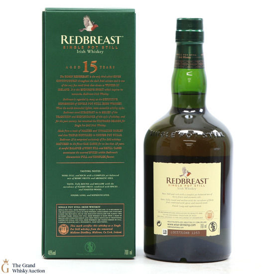 Redbreast is a single pot still whiskey distilled at New Midleton in Ireland using a combination of malted and un-malted barley. Triple distilled in copper pot stills. Redbreast 15 Year Old has won awards including a Gold Medal at the International Spirits Challenge 2010.