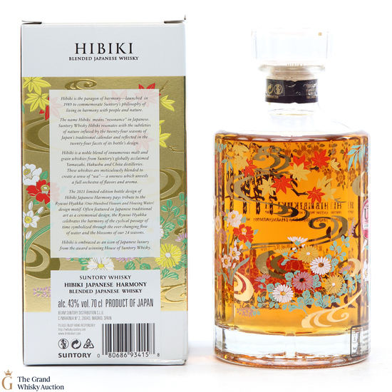 This is a limited edition, specially designed bottle with painted flowers and flowing ribbons of water. The 2021 special edition pays homage to the Ryisui-Hyakka (One Hundred Flowers and Flowing Water) and celebrates different seasonal flowers which help characterise the Japanese seasons. 5 types of casks were used and in typical Hibiki fashion, the bottle always has 24 facets which represent 24 seasons in the Japanese lunar calendar.