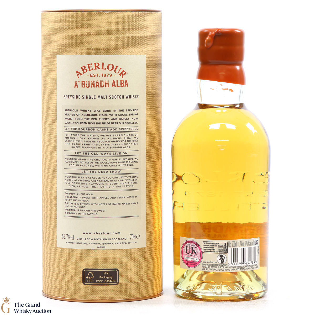 Distilled at the Aberlour Distillery, this single malt was matured in bourbon oak barrels until being bottled at the cask strength of 62.7% ABV. This is batch 5 of the A'Bunadh Alba.