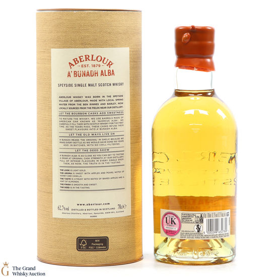 Distilled at the Aberlour Distillery, this single malt was matured in bourbon oak barrels until being bottled at the cask strength of 62.7% ABV. This is batch 5 of the A'Bunadh Alba.