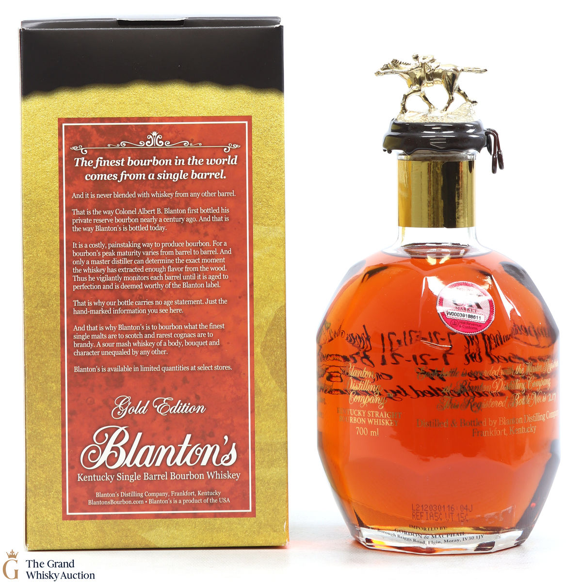 PLEASE NOTE: The wax seal on Blanton's bottles are prone to cracking in transit due to their design. Therefore, as stated in our T&C’s, we do not and will not accept liability should the seal be breached, broken, split or leak in transit. Additionally, please know due to the design of the internal cardboard packaging that surrounds the top of the bottles, it too may be torn. By bidding on this lot you have understood this to be true. Insurance is for complete breakage or loss in transit only.