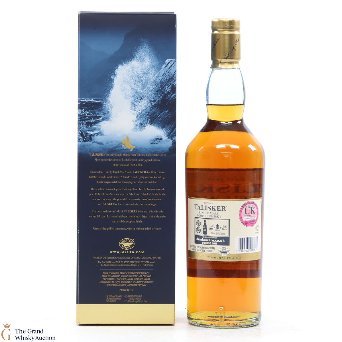 Time has mellowed but not tamed this powerful 18 year old Talisker, made beside Loch Harport in the shadow of the Cuillin range. A rich, sweet nose introduces familiar, smoky maritime aromas. Full-bodied, this smooth malt open sweetly, then becomes more assertive, with a whiff of smoke. It has an unmistakeable, richly warming finish, more subtle here than in the 10 year old.