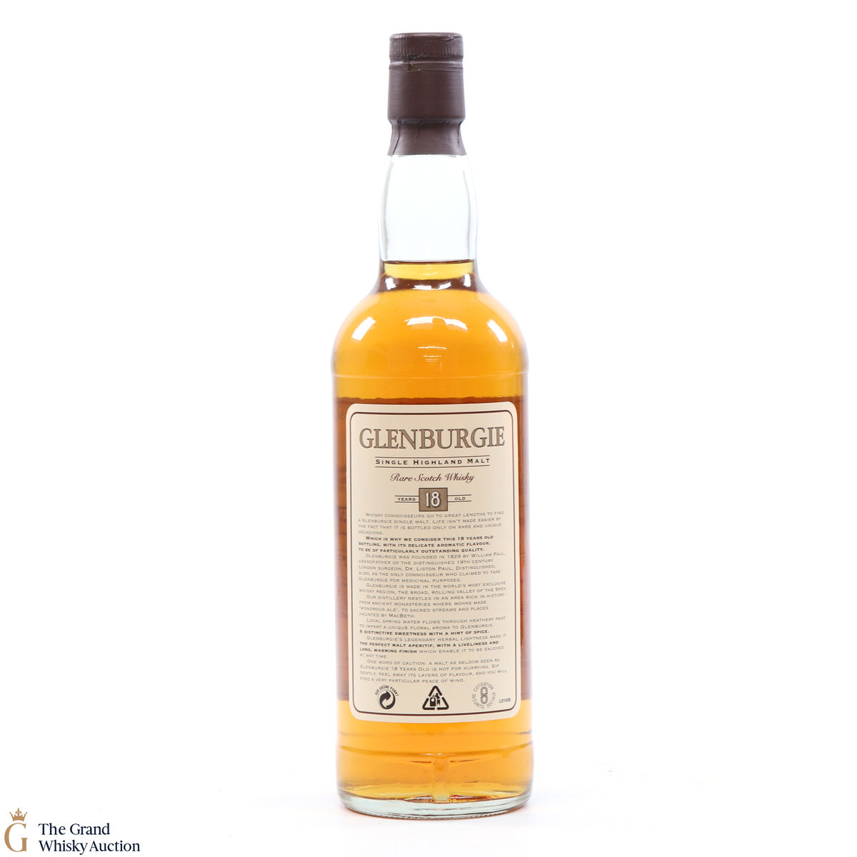 Due to the various ages of bottles and their seals, the condition of liquid is at the buyer's discretion and no claim can be lodged against failure/leakage in transit. Loss and breakage cover is available at 3% of the hammer price as standard. If the lot is not insured, no claim can be lodged against the courier or The Grand Whisky Auction for breakage or loss in transit.