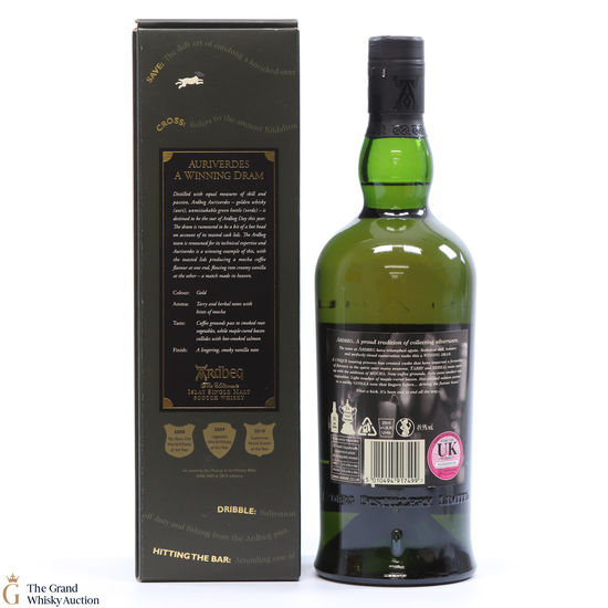 This special edition Ardbeg single malt was released on Ardbeg Day 2014. during Feis Ile. Auri(Gold) verdes (Green) it refers to the golden whisky and the iconic Ardbeg green bottle of Ardbeg whisky. It is said to be a dram of two halves - the whisky uses toasted cask lids to create Mocha Coffee flavours that team up with creamy vanilla.