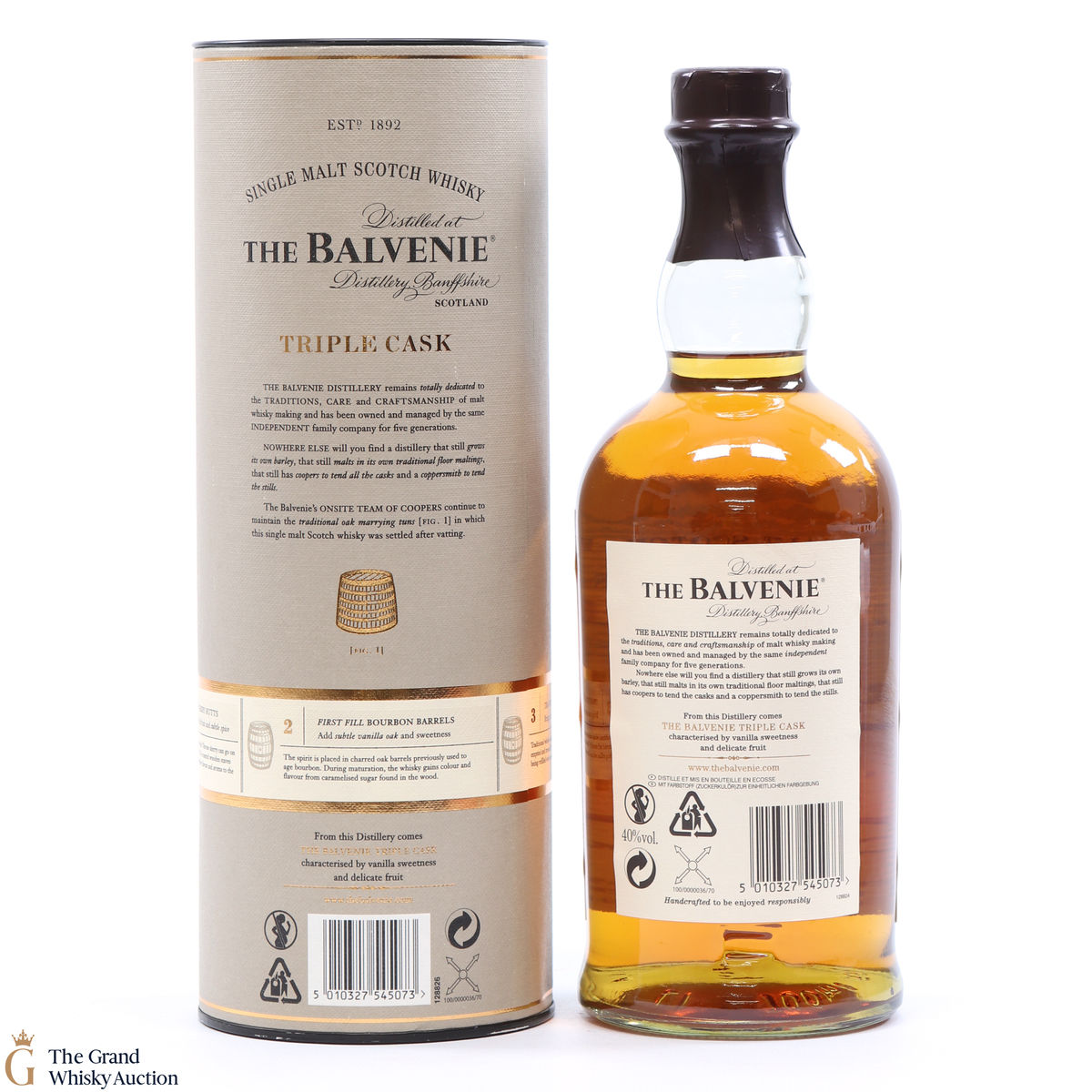The Balvenie Triple Cask is a single malt Scotch whisky from this renowned Speyside based distillery. Matured in American oak barrels, traditional refill casks and first-fill Oloroso sherry butts, this single malt has a complex taste yet brings a great balance of fruit and vanilla.