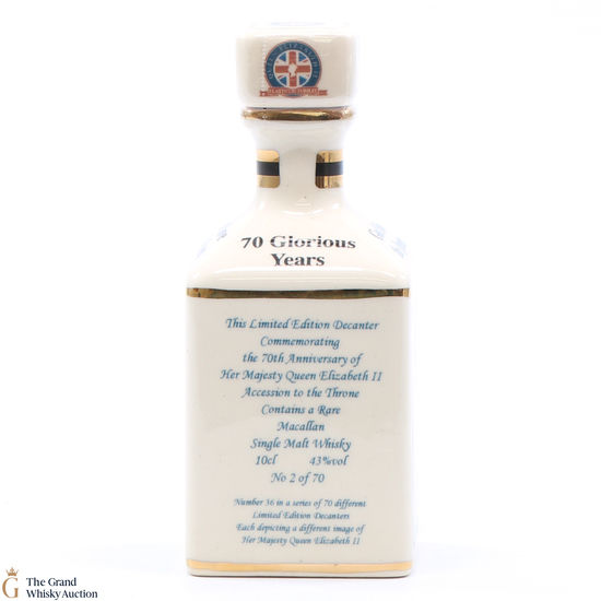 A mini decanter commemorating the 70th Anniversary of Her Majesty Queen Elizabeth II Accession to the Throne. Filled with a rare Macallan, this is one of 70 bottles released.