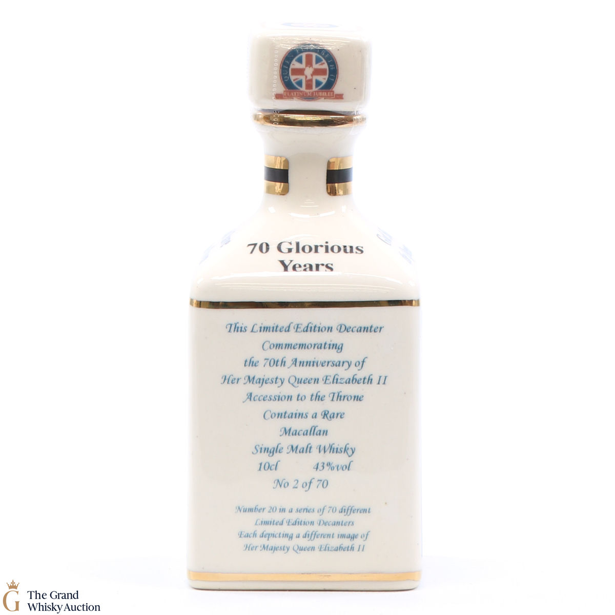 A mini decanter commemorating the 70th Anniversary of Her Majesty Queen Elizabeth II Accession to the Throne. Filled with a rare Macallan, this is one of 70 bottles released.