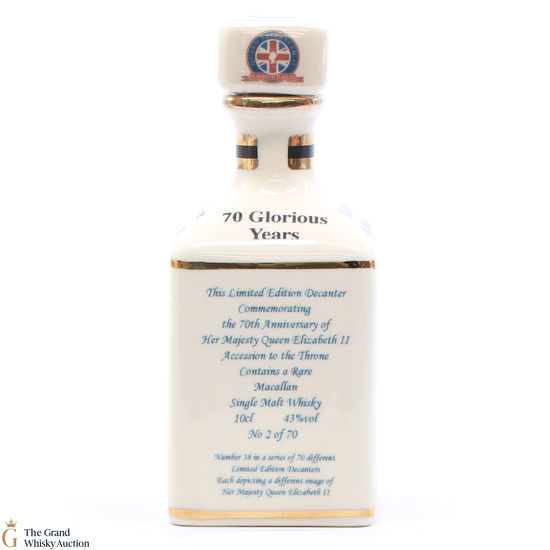 A mini decanter commemorating the 70th Anniversary of Her Majesty Queen Elizabeth II Accession to the Throne. Filled with a rare Macallan, this is one of 70 bottles released.