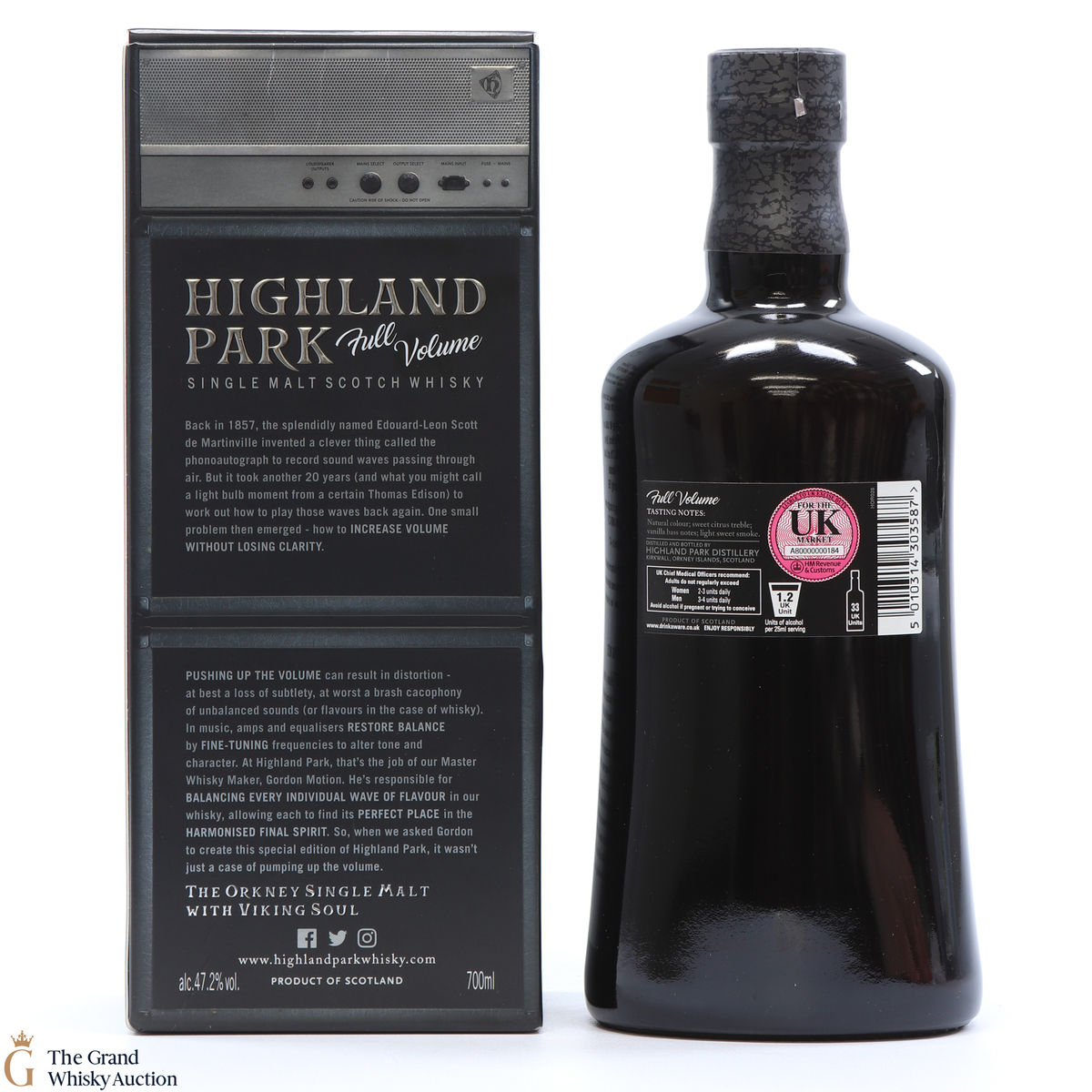 Full Volume by Highland Park was distilled in 1999 and bottled in 2017 from 481 casks. The single malt was matured exclusively in first-fill bourbon casks and was bottled at 47.2% ABV and comes presented in a themed presentation box resembling speaker.