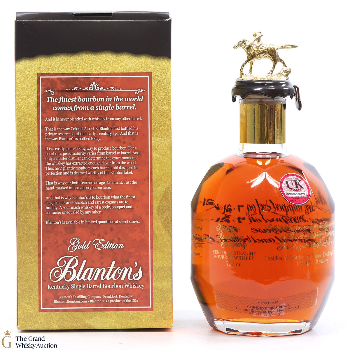 PLEASE NOTE: The wax seal on Blanton's bottles are prone to cracking in transit due to their design. Therefore, as stated in our T&C’s, we do not and will not accept liability should the seal be breached, broken, split or leak in transit. Additionally, please know due to the design of the internal cardboard packaging that surrounds the top of the bottles, it too may be torn. By bidding on this lot you have understood this to be true. Insurance is for complete breakage or loss in transit only.