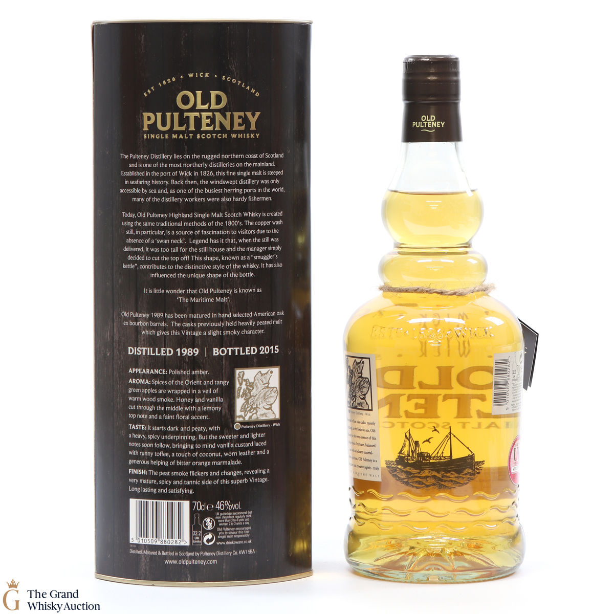 This Old Pulteney 1989 vintage was awarded World's Best Single Malt Whisky at the 2016 World Whiskies Awards. To give the 1989 vintage a peaty, smoky character, the whisky was matured in American oak ex-bourbon barrels, which previously held heavily peated malt.