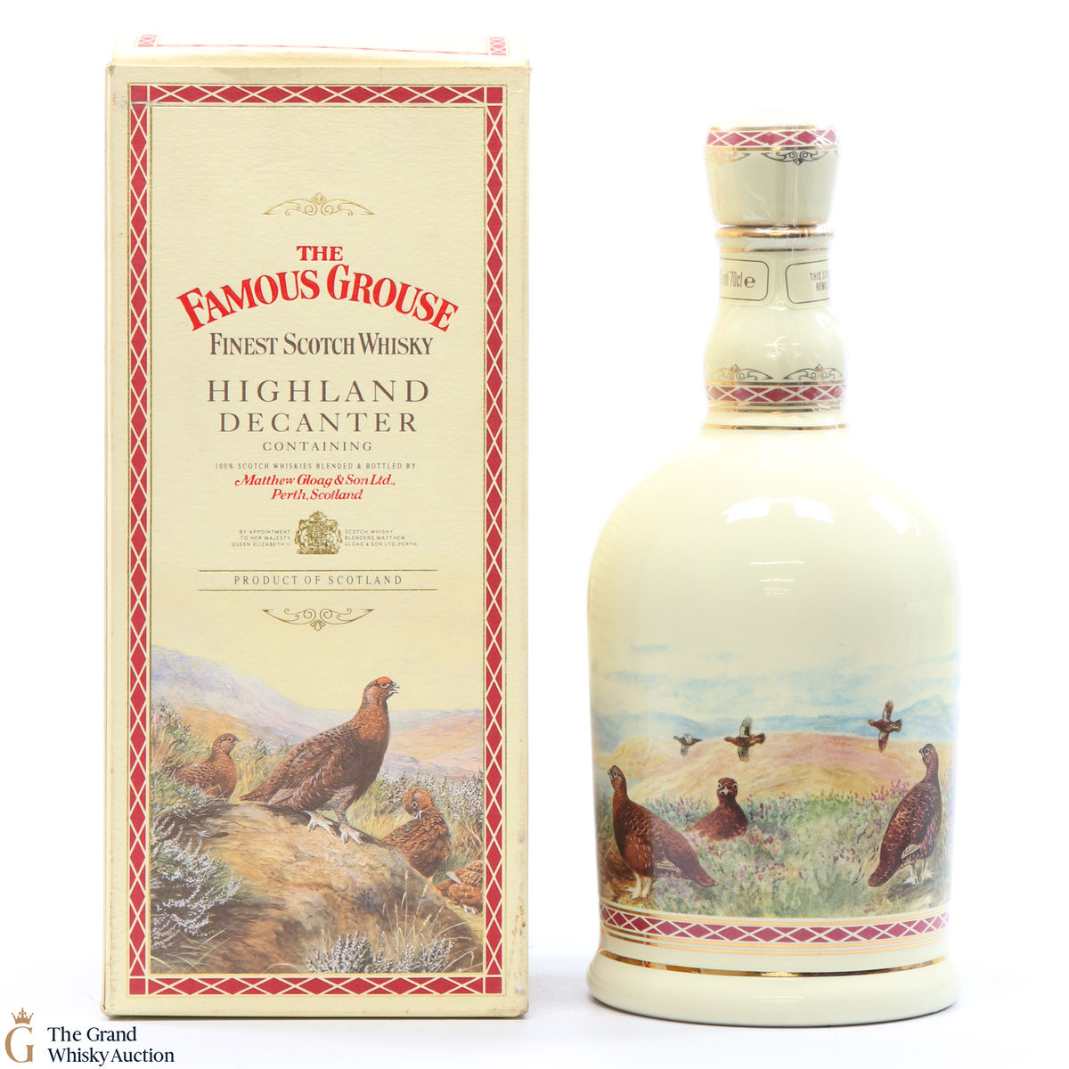 A bottle of Famous Grouse housed within a ceramic 'Highland' decanter. First blended by Matthew Gloag & Son in 1896, as of 2013, it has been the highest selling brand of whisky in Scotland since 1980.
