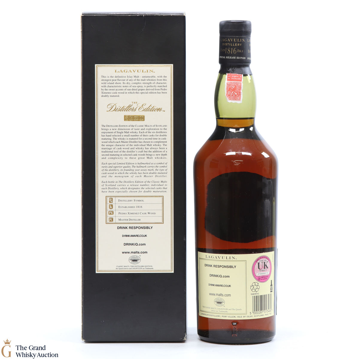 This Lagavulin Distillers Edition was distilled in 1994 before being bottled in 2010. This 16-year-old (ish) single malt whisky of the Classic Malts Selection was matured twice in European Pedro Ximenez Sherry oak casks - these give the whisky more fruity and syrupy character.