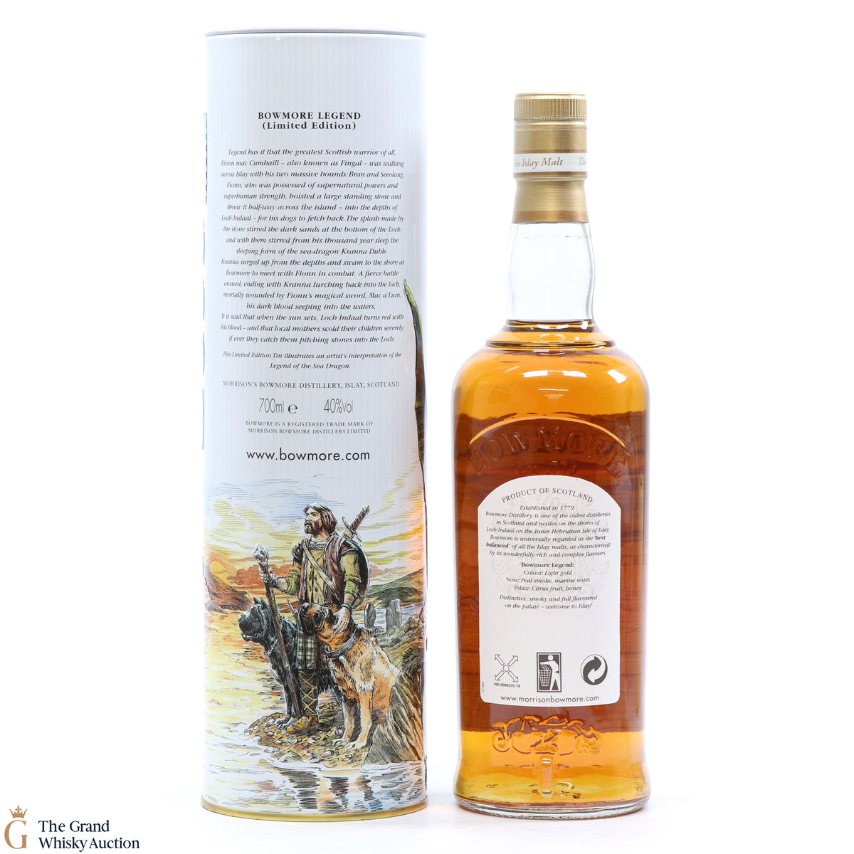 The ‘Legend’ is a no-age-statement whisky that showcases Bowmore distillery’s classic peat smoke. A Bowmore Legend (Limited Edition). Created in the Bowmore Distillery one of the oldest distilleries in Scotland. Part of a distinctive series of limited edition tins, the illustration is shown on the tin depicts the Legend of the Sea Dragon.