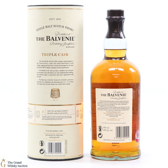 The 12 year old Triple Cask expression is part of Balvenie's travel retail range. It is made with whisky matured in three different types of cask, namely first-fill American oak barrels, traditional refill casks and first-fill Oloroso Sherry butts. Following the maturation, the whisky is married together to create a cohesive, flavoursome expression packed with orchard fruit, custard cream and cinnamon spice. This is a 1L bottling.