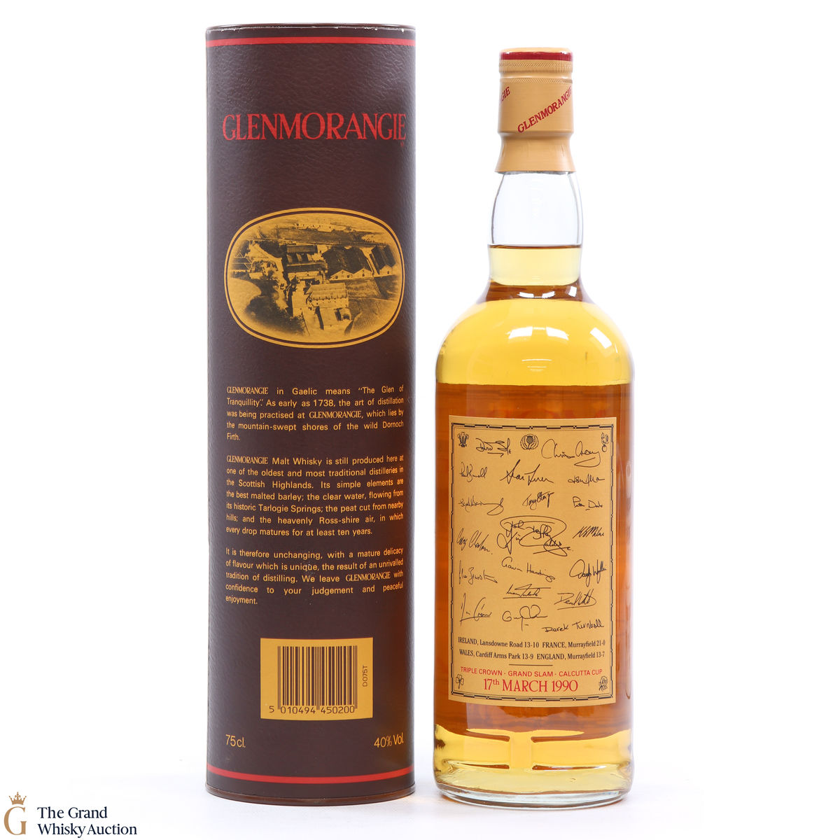 This bottle of Glenmorangie 10 Year Old was released in celebration of the Scottish Rugby Team's Grand Slam win in 1990 - the victory took place on 17th March 1990 and this is detailed on the neck label.