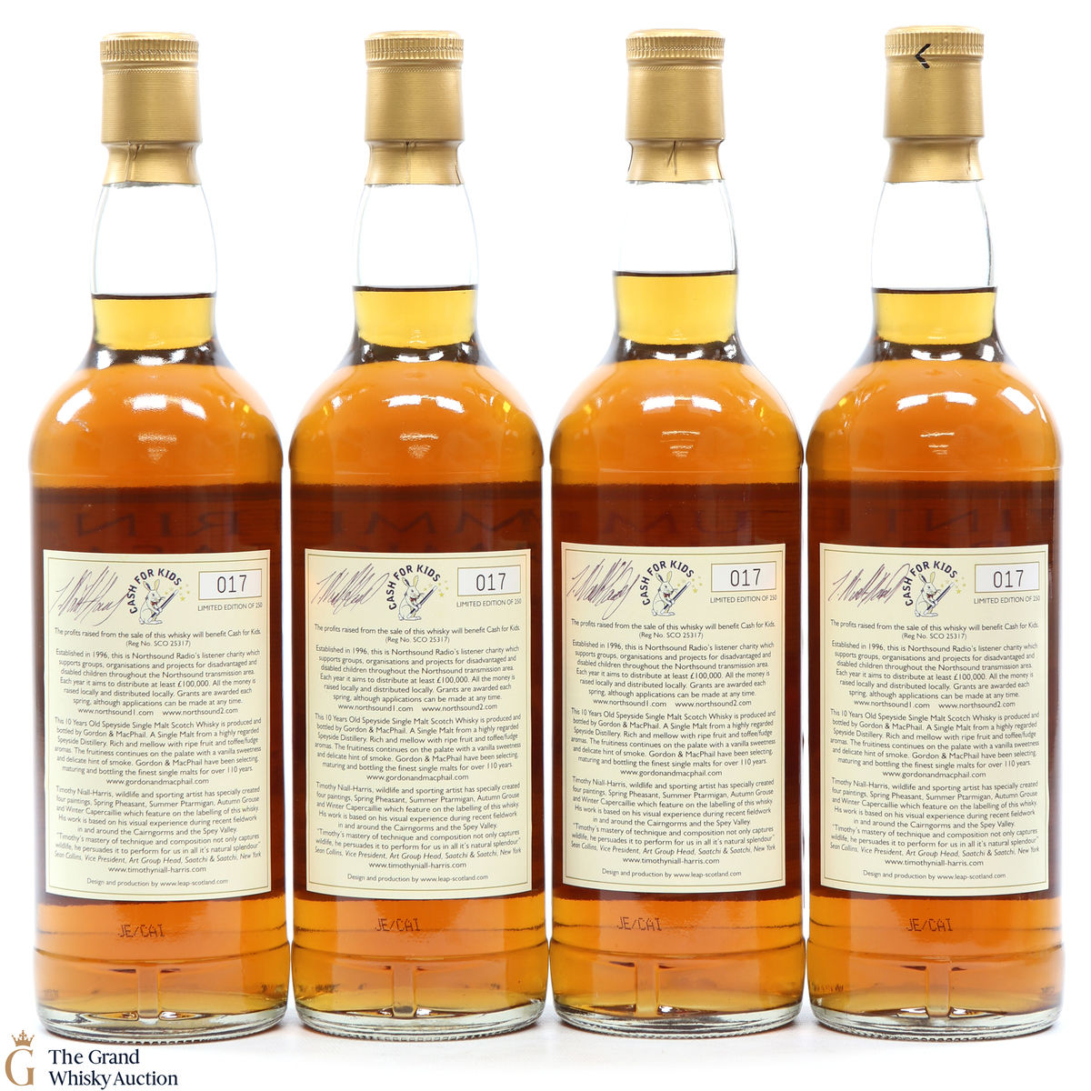 These 4 x 10-Year-Old Speyside Single Malts were produced and bottled by Gordon & MacPhail and are from an undisclosed 'highly regarded Speyside distillery'. The bottle labels feature designs by Timothy Naill-Harris wildlife and sporting artist. The bottles were created in aid of Cash For Kids for Northsound Radio.