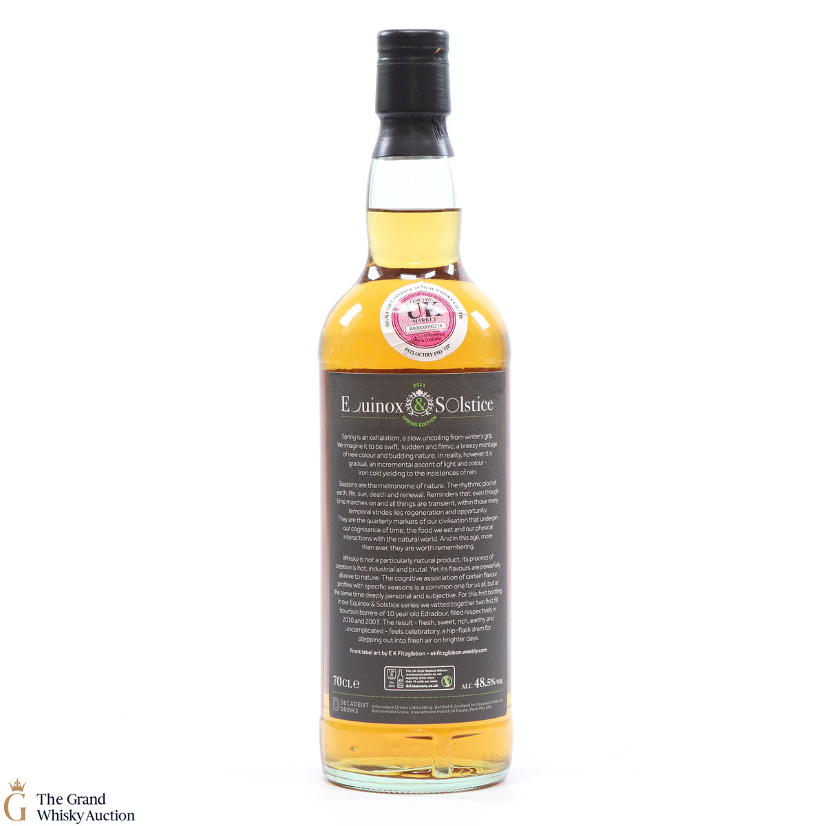 Distilled at Edradour Distillery, this single malt is the first bottling in Decadent Drinks Equinox & Solstice series. To create this whisky, Decadent Drinks vatted together two first fill bourbon barrels containing 10 year old Edradour filled in 2010 and 2003 respectively.