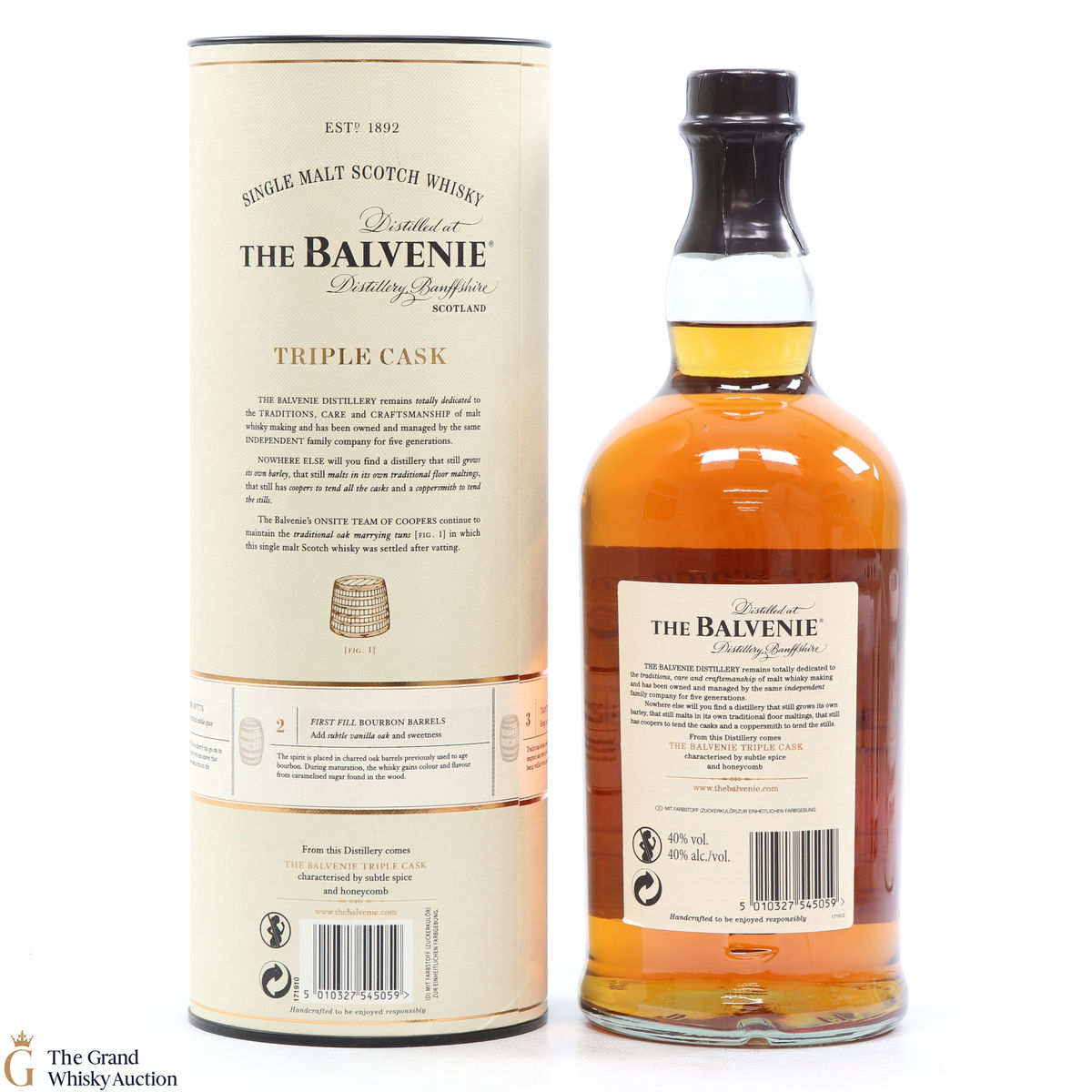 The 12 year old Triple Cask expression is part of Balvenie's travel retail range. It is made with whisky matured in three different types of cask, namely first-fill American oak barrels, traditional refill casks and first-fill Oloroso Sherry butts. Following the maturation, the whisky is married together to create a cohesive, flavoursome expression packed with orchard fruit, custard cream and cinnamon spice. This is a 1L bottling.