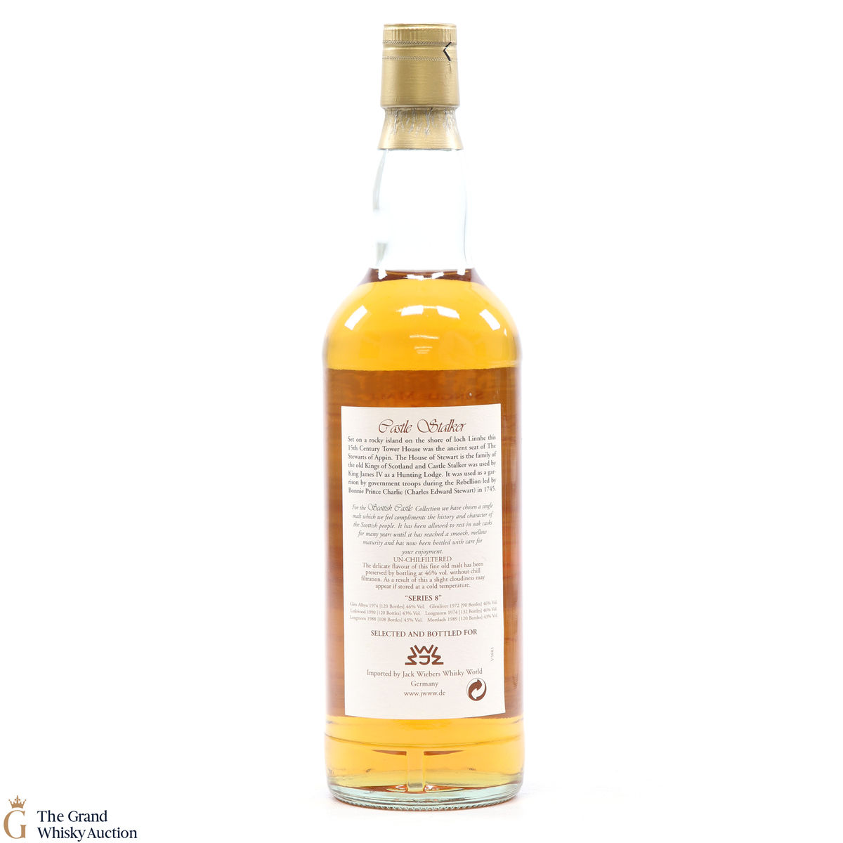 Due to the various ages of bottles and their seals, the condition of liquid is at the buyer's discretion and no claim can be lodged against failure/leakage in transit. Loss and breakage cover is available at 3% of the hammer price as standard. If the lot is not insured, no claim can be lodged against the courier or The Grand Whisky Auction for breakage or loss in transit.