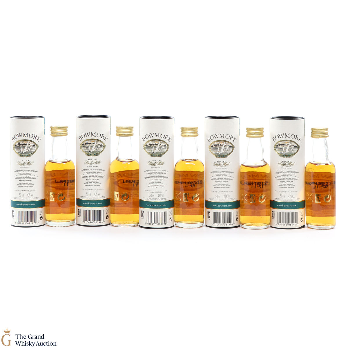 This lot contains 5 x 5cl bottling of 12-Year-Old Bowmore. This single malt has coastal notes with gentle peat.